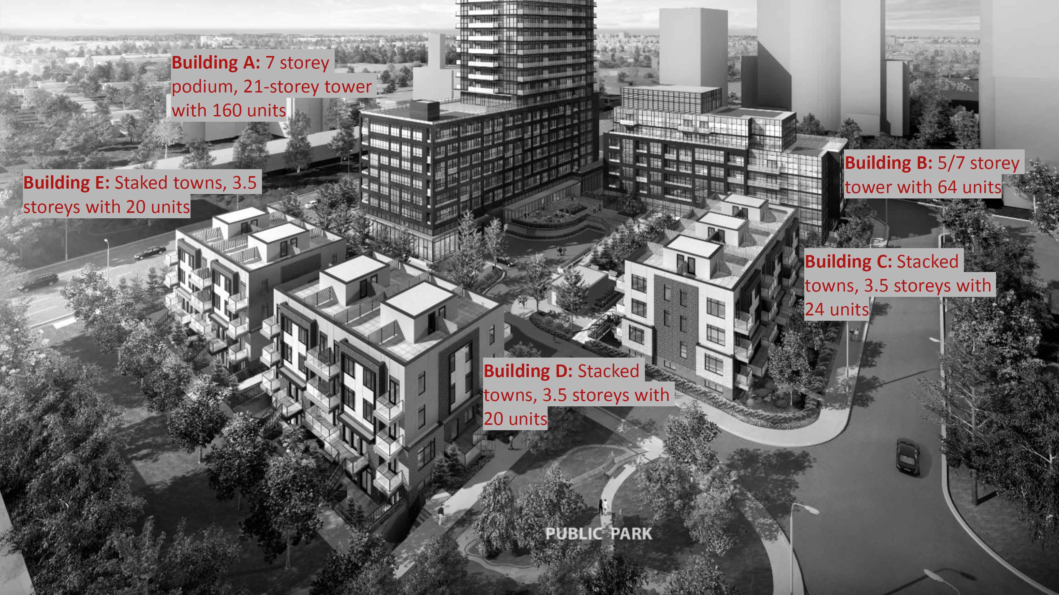 - Programme mix (brief): A 21-storey over 7-storey podium (~160u); B 5/7-storey (~64u); C/D/E stacked towns (24/20/20)